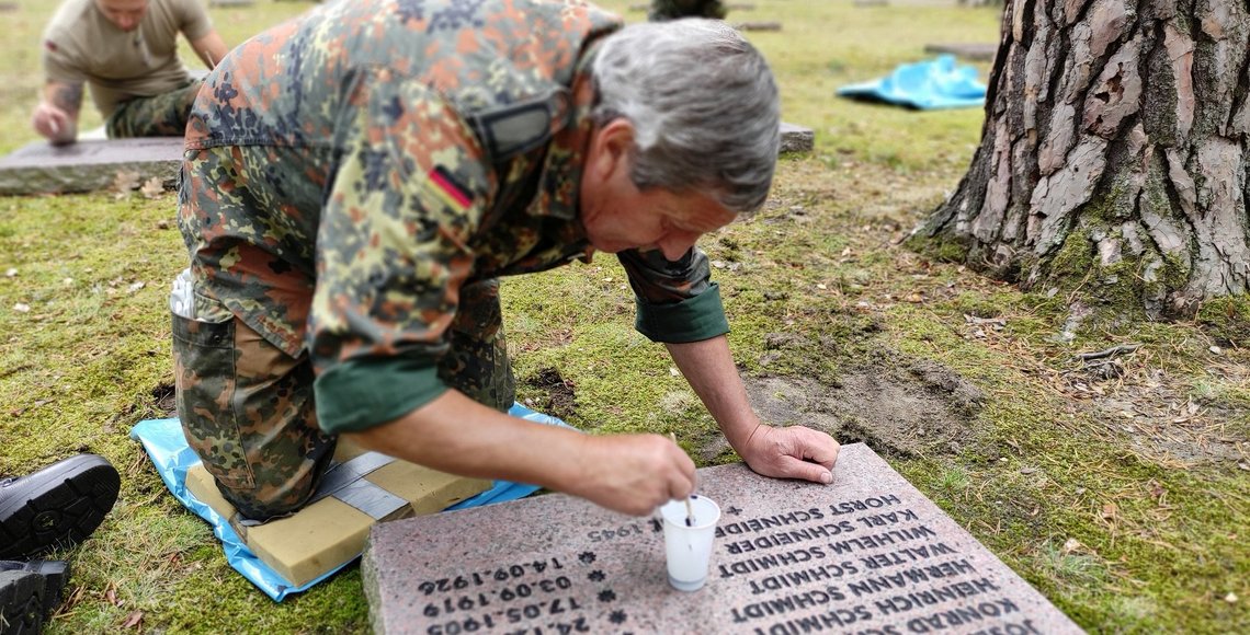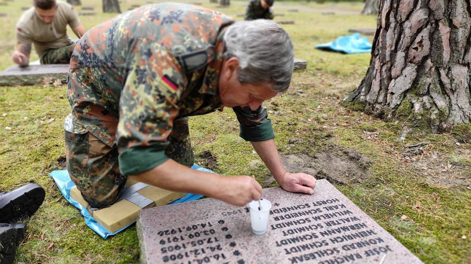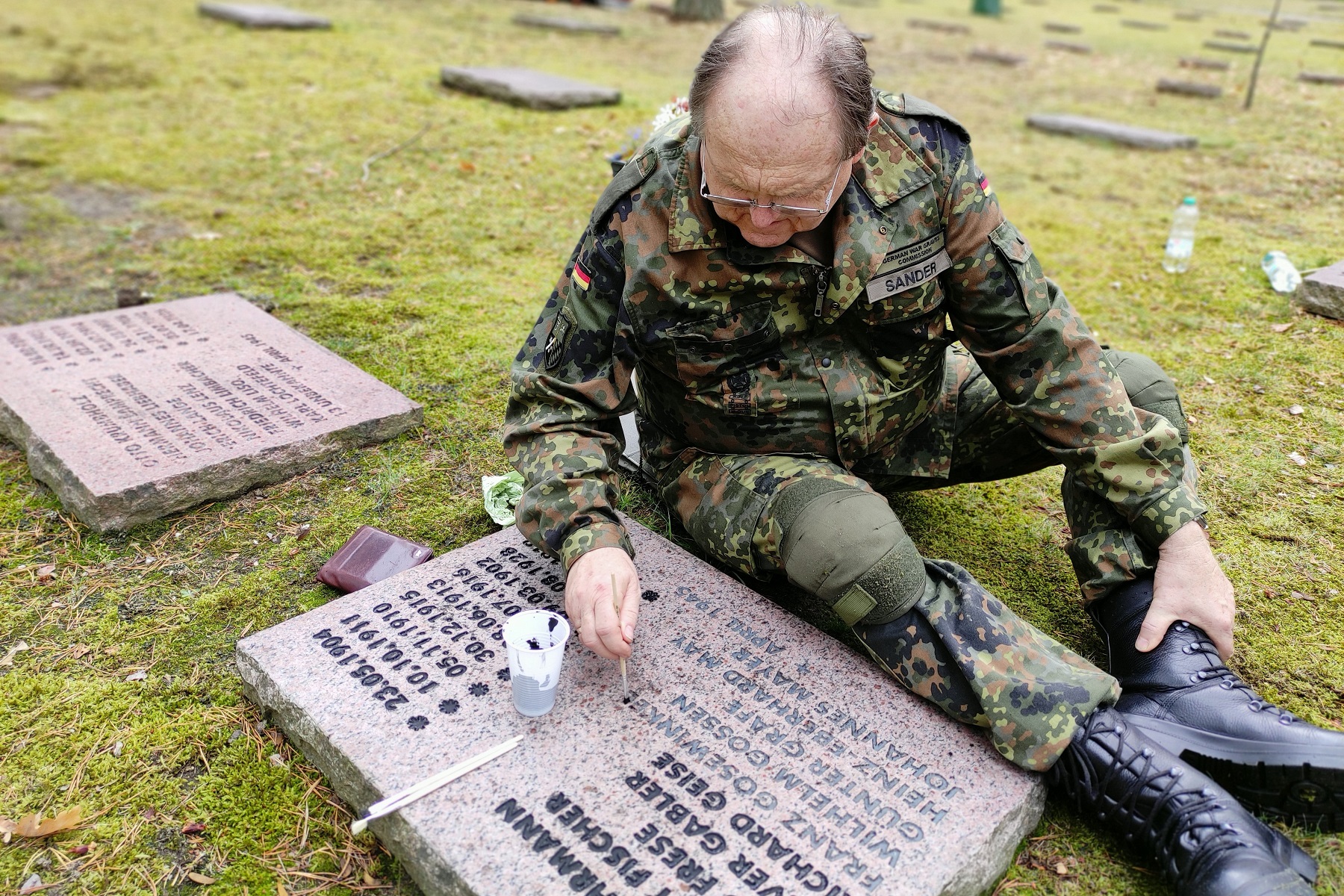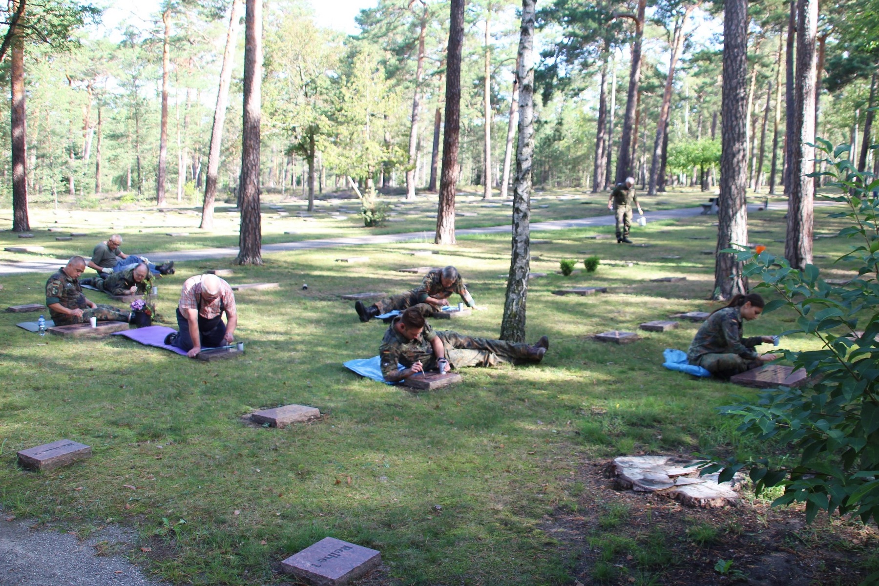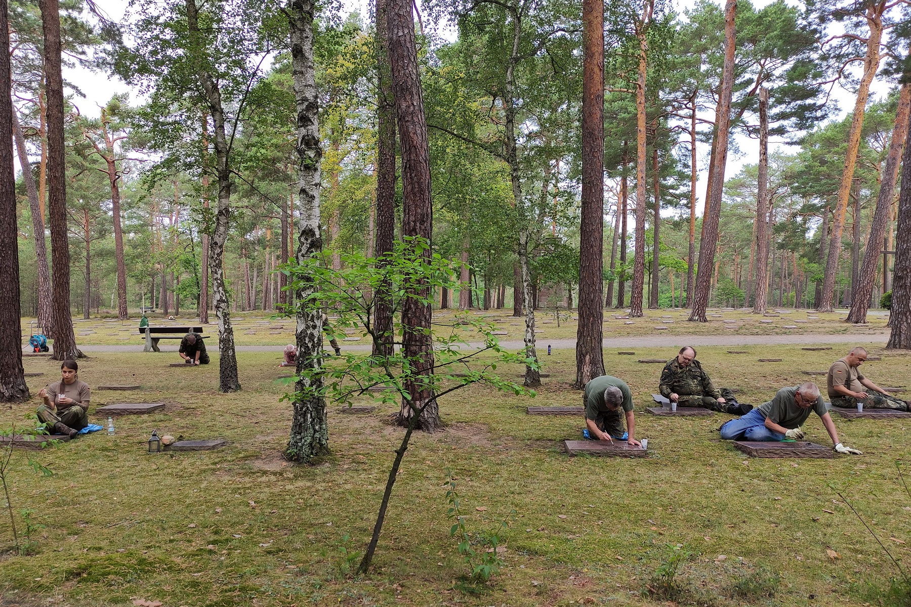 Zu diesen Unterstützern gehören auch die seit Jahren für den Volksbund tätigen Reservisten der Kreisgruppe Oberbayern-Nord im Verband der Reservisten der Deutschen Bundeswehr (VdRBw) e.V. Der diesjährige Kommandoführer, Stabsunteroffizier d.R. Dipl.-Ing. Wolfgang Christmann, Ingolstadt, erneuerte mit seinen Männern die Inschriften mehrerer Grabsteine, reinigte Dachflächen und befreite diese von Laub und Reisig. Christmann lobte die Zusammenarbeit und insbesondere die klare Kommunikation mit den Volksbundmitarbeitern vor Ort in Halbe und den generell hohen, allseitigen Organisationsgrad der Aktion. Sehr zufrieden schienen auch die anderen Teilnehmer des Arbeitseinsatzes gewesen zu sein; Oberstabsfeldwebel d.R. Alfred Veeth, ein langjähriger Teilnehmer der Gruppe, der auch mit anderen Reservistenkameradschaften Arbeitseinsätze absolvierte, wörtlich: „Wolfgang Christmanns Arbeitseinsätze gehören zu den bestorganisiertesten und kameradschaftlichsten, an denen ich je teilgenommen habe.“