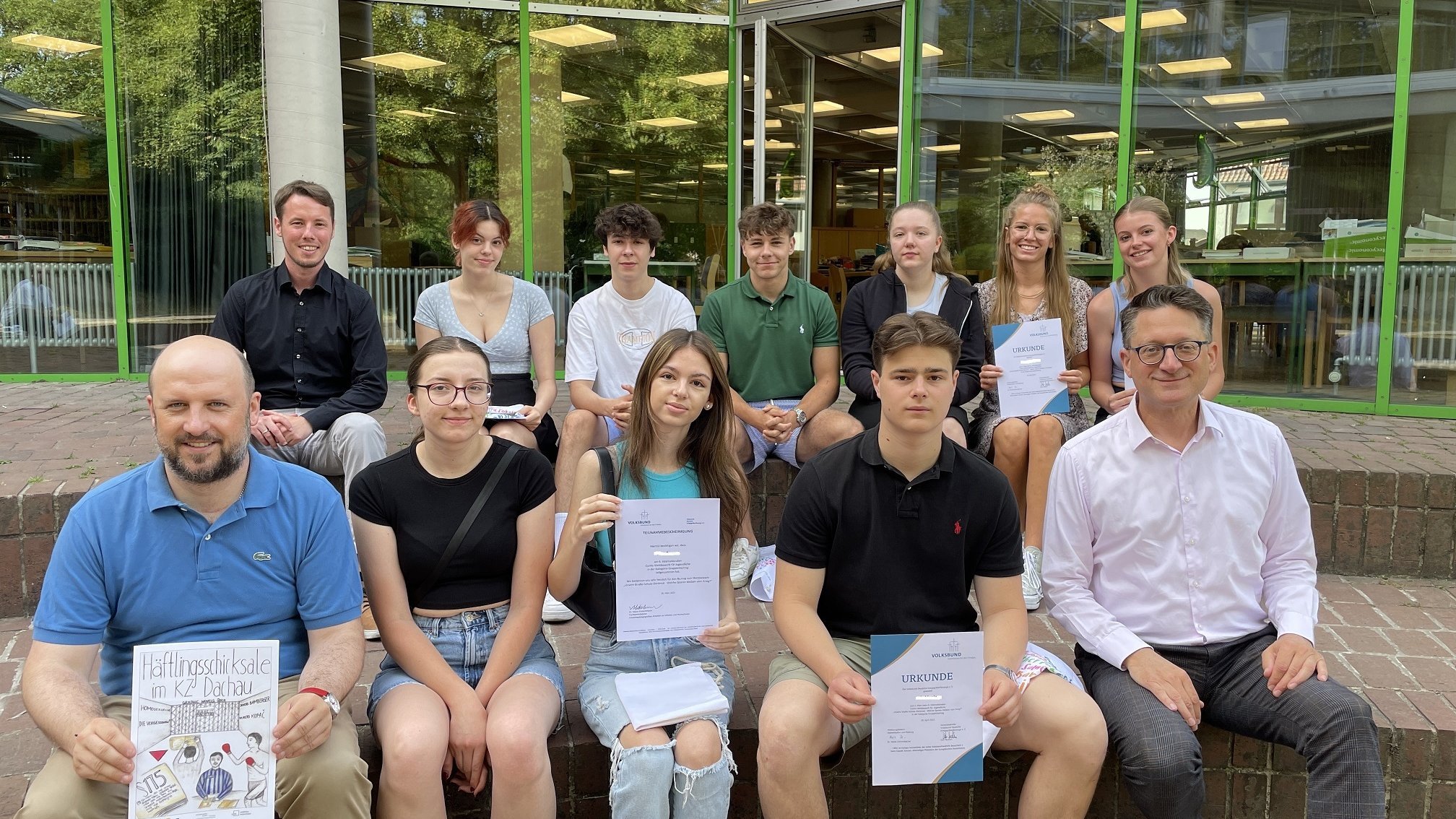 Nun erhielten die Schülerinnen und Schüler des Oberstufenseminars ihre Urkunden und Preisgelder durch den Bildungsreferenten des Landesverbandes Bayern, Maximilian Fügen, überreicht. Die beiden ausgezeichneten Beiträge setzten sich mit den Verfolgtengruppen der Homosexuellen und der sogenannten „Asozialen“ innerhalb des KZ-Systems auseinander. Hierzu sagte Fügen in seiner Laudatio: „Beide Comics zeichnet aus, dass sie nicht nur die Verbrechen in der NS-Zeit thematisieren, sondern auch auf die ungerechte Behandlung beider Opfergruppen bis in die jüngste Vergangenheit hinein eingehen. Der sogenannte „Homosexuellen Paragraph“ 175 wurde erst 1994 abgeschafft und erst 2002 wurden die Urteile gegen Homosexuelle in der NS-Zeit durch den Bundestag aufgehoben. Die Anerkennung von sogenannten „Asozialen“ als Opfergruppe der Nationalsozialisten erfolgte sogar erst 2020. Ihr habt mit euren Comics einen wichtigen Beitrag gegen das Vergessen und für eine zeitgemäße Gedenkarbeit geleistet.“